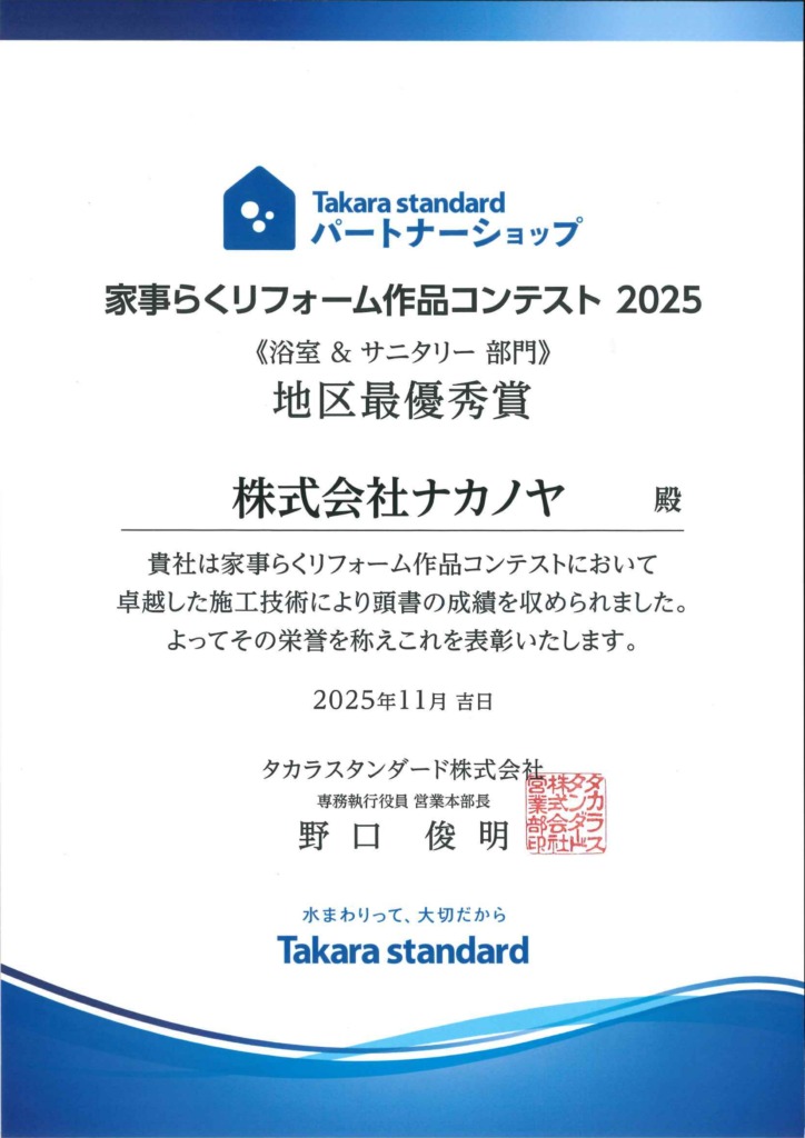 【タカラスタンダード】家事らくリフォーム作品コンテスト2025 浴室&サニタリー部門 地区最優秀賞を受賞